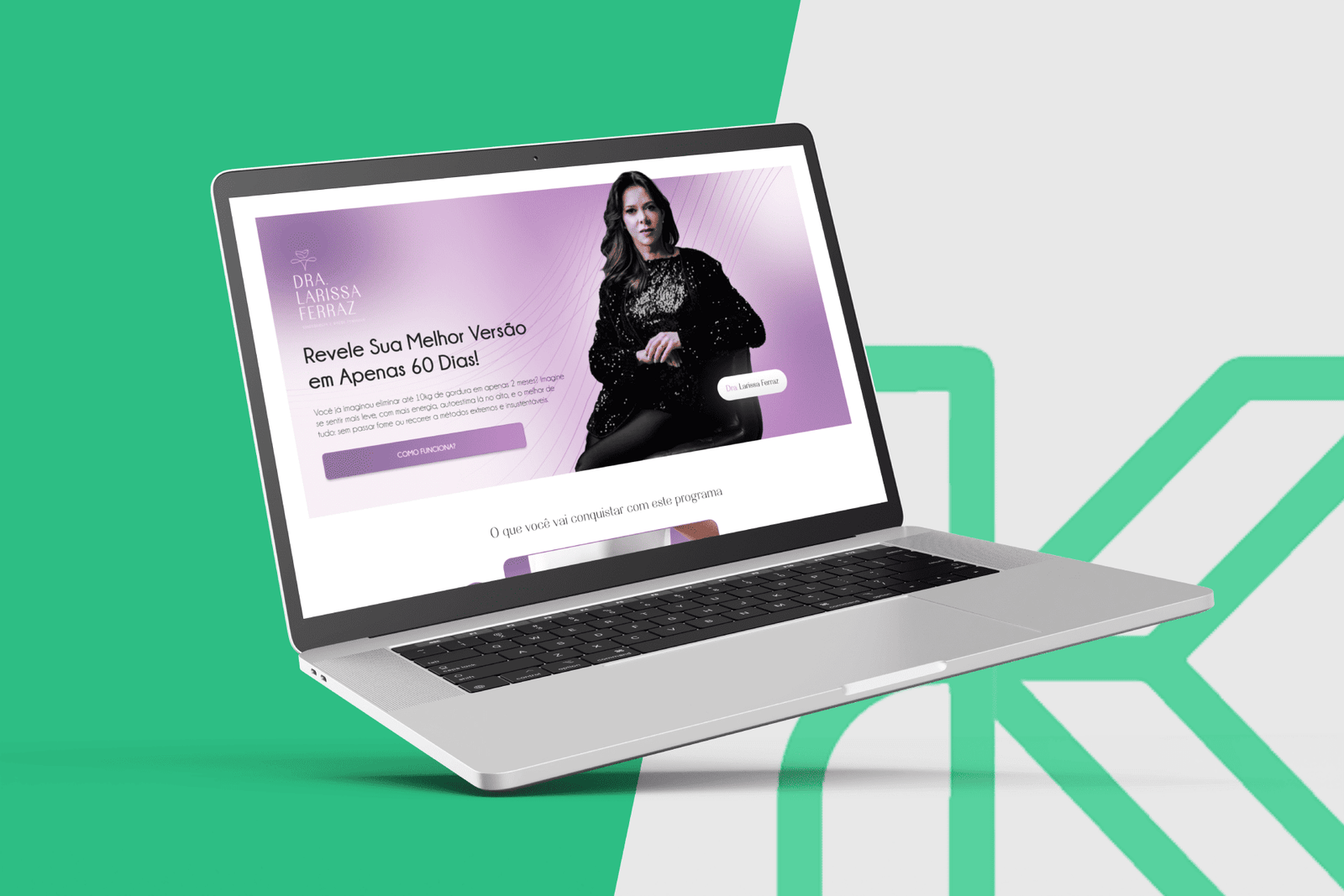 Começamos com o design UI/UX, criando um layout intuitivo e visualmente atraente, que reforça a imagem profissional de Larissa e seu conhecimento no universo da nutrição. O layout organiza seções estratégicas para apresentar seus serviços, diferenciais, benefícios da consultoria e chamadas para ação claras.